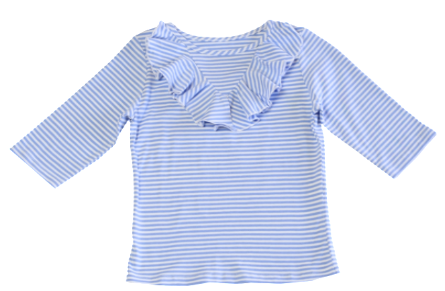 Top off your fall fashions with our adorable BB top in assorted colors. A classic ruffle top with elbow-length sleeve is the perfect pairing with skirts or jeans. Periwinkle stripe works with prints and solids. This is great for fall and will carry into spring.