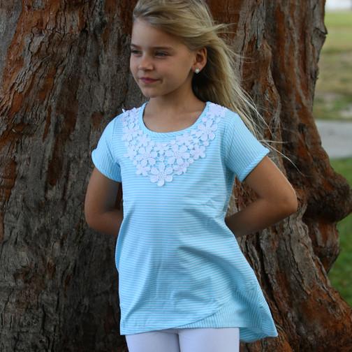 Layered with style and a touch of lace, the Kel Belle top is sure to be a favorite in her wardrobe. Paired with our versatile Sweet Pea Capris, this top adds a little bit of flair to her everyday look. The Kel Belle top in Aqua Stripe is just what she needs to be the belle of the playground.