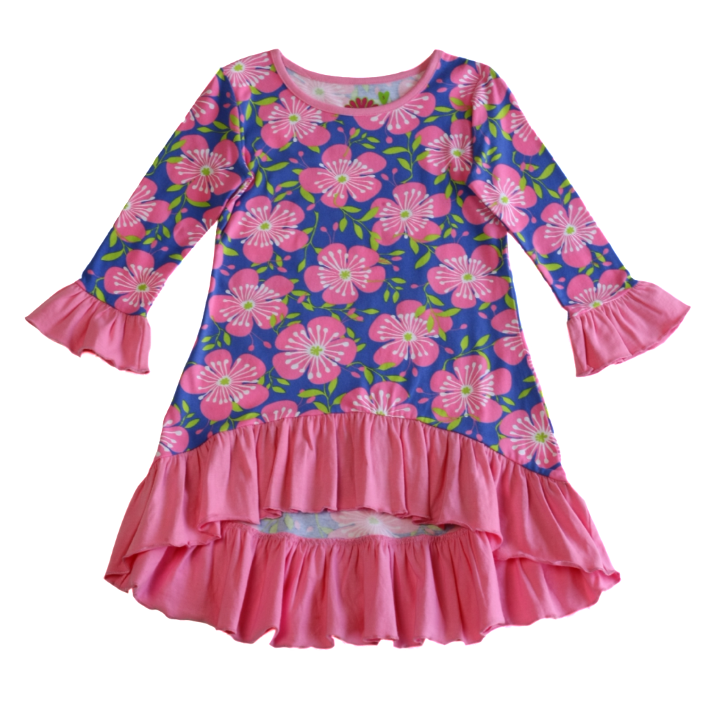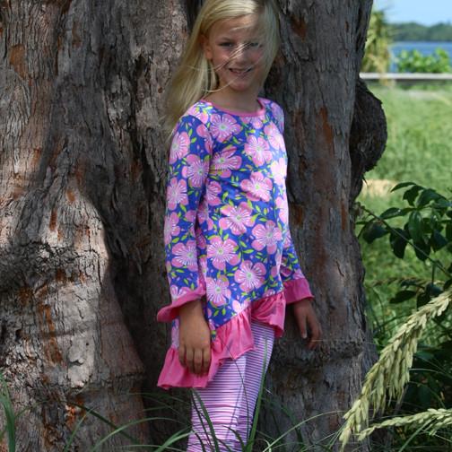 Add a touch of drama to her style in our Sandy cutaway top with ruffle hemline and sleeves. Just enough style to compliment our Lucky pant or colorful Peggy leggings.