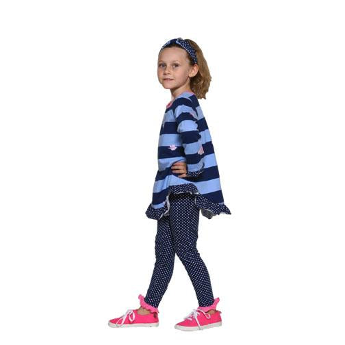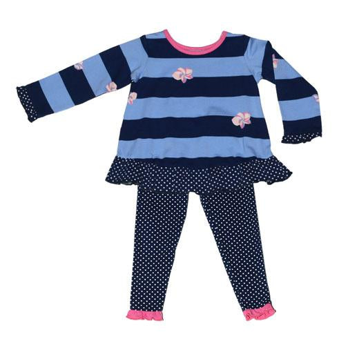 The Allie two piece pantsuit offers a unique combination of easy ware, easy care and comfort for little girls. The periwinkle and navy strip top with a small navy pin dot ruffle and pink Pumeria flowers works back perfectly with the navy pin dot leggings. The perfect classic for Fall!
