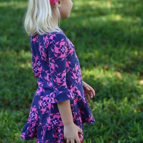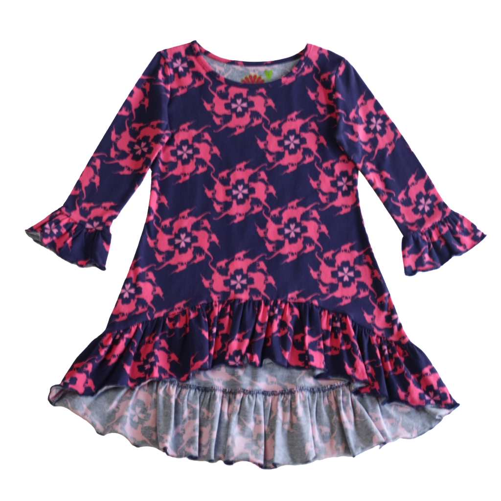 Add a touch of drama to her style in our Sandy cutaway top with ruffle hemline and sleeves. Just enough style to compliment our Lucky pant or colorful Peggy leggings.