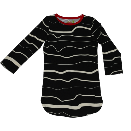 Tee shirt dresses are all the rage and ours is spot on for comfort and style. Our Sweet Tea shirt dress is perfect with or without leggings. Long sleeves that taper to the wrist with a cutaway hemline defines this dress, ideal for any occasion. Black with off-white wavy bands, accented with red make this dress ready for fall or the holidays.