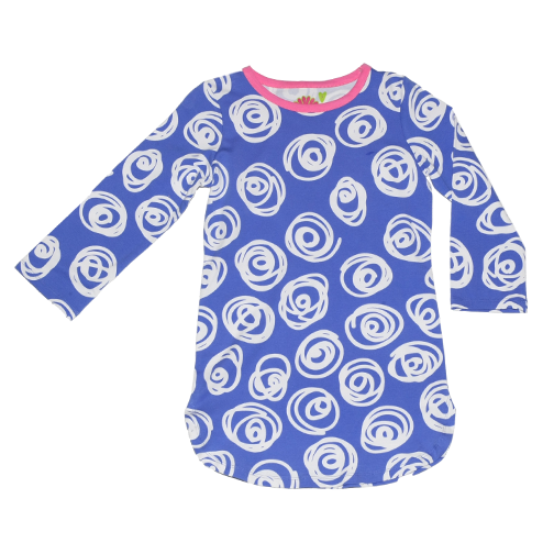 Dark Peri with a splash of pink make the perfect combo in our Sweet Tea T shirt dress. Scribbles and whirls in white sets off this print to make every girl shine. Nothing is better than a simple comfy dress that is easy to just throw on and go, scream style in our Sweet Tea Twirl.