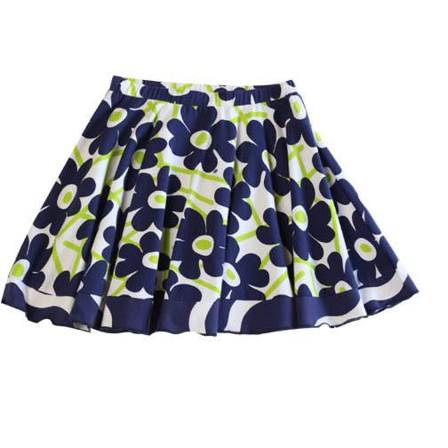 Twirl and shout in our "Twirly Skirt". Bright colors in original prints make every girl smile. Twirl Approved and ready to go for the active fashion minded young lady. Our Twirly skirt looks good and feels good in navy and white crazy daisy's giving that young lady a little pep in her step.