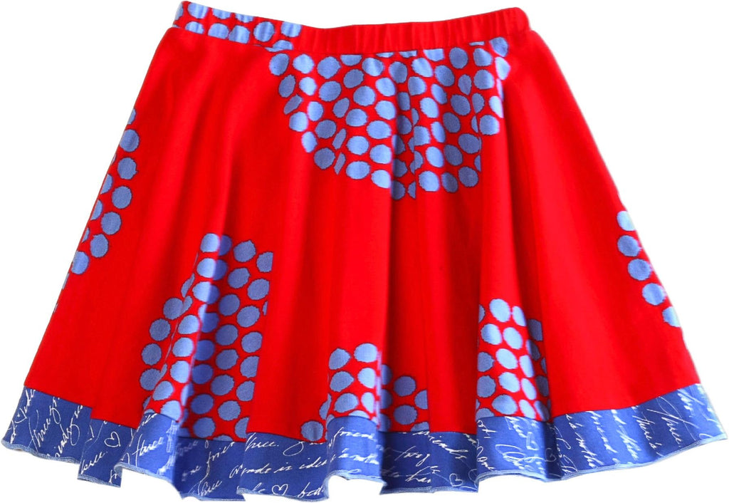Twirl and shout in our "Twirly Skirt".. Bright colors in original prints make every girl smile. Twirl Approved and ready to go for the active fashion minded young lady. Our Twirly Skirt looks good and feels good in festive peri fireworks on red giving that young lady a little pep in her step.